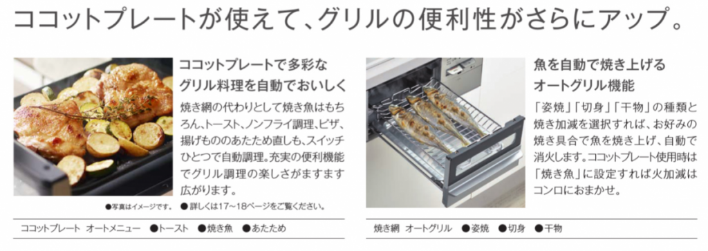 リッセには最上級グレードに搭載されている「イージークリーン機能」、「スモークオフ機能」が搭載されており、ココットプレートを使用するとグリル内部も清潔に保てます♪